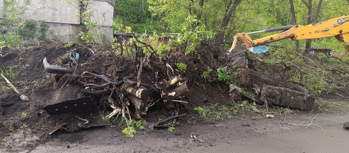 Для удаления крупных остатков, пней срубленных деревьев и кустов применяется тяжелая спецтехника. Это гусеничные бульдозеры с клыком или рыхлителем, которые вгрызаются в почву и легко выдергивают застарелые корни. С помощью экскаватора можно окопать пень и обнажить сеть корней, чтобы потом можно их срезать, и потом стрелой погрузить отстаток в кузов грузовика для вывоза. На некоторые модели экскаваторов и тракторов можно установить навесной мульчер (фреза, пила или диск), который легко измельчает толстые стволы деревьев и кустарники на мелкие куски и щепу.